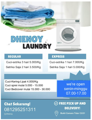 Jangan biarkan cucian menumpuk! Dhenoy Laundry siap melayani kebutuhan laundry Anda dengan layanan profesional dan praktis. Nikmati kemudahan GRATIS ANTAR JEMPUT untuk area terdekat, sehingga Anda bisa menghemat waktu dan tenaga.
